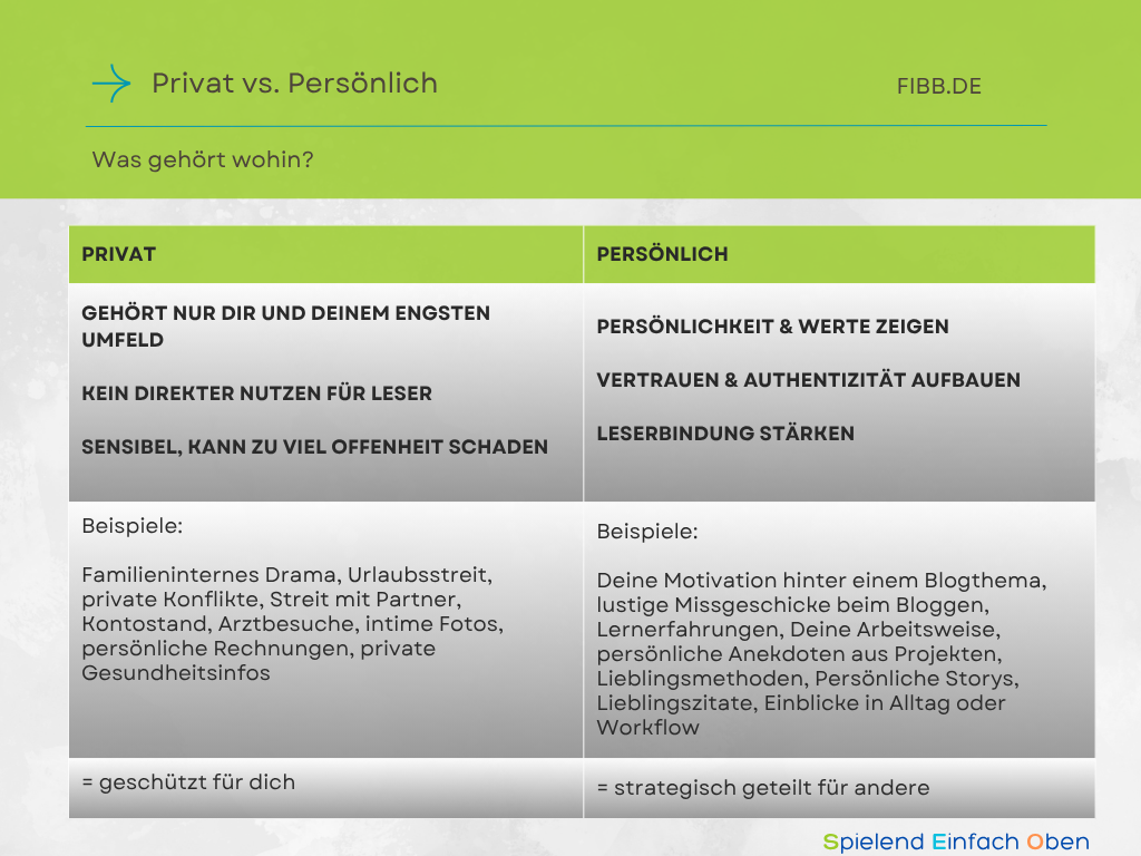 Der Unterschied ist klar: privat ist privat, und ich entscheide allein, wie viel davon auf meinen Blog darf.