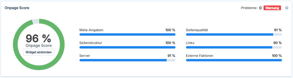 Nach nur 10 Minuten Arbeit, sieht mein Onpage-Score so richtig gut aus. Die restlichen Prozent brauchen etwas länger, nachdem ich aber ein Verfechter des Pareto-Prinzips bin, bin ich damit mehr als zufrieden.